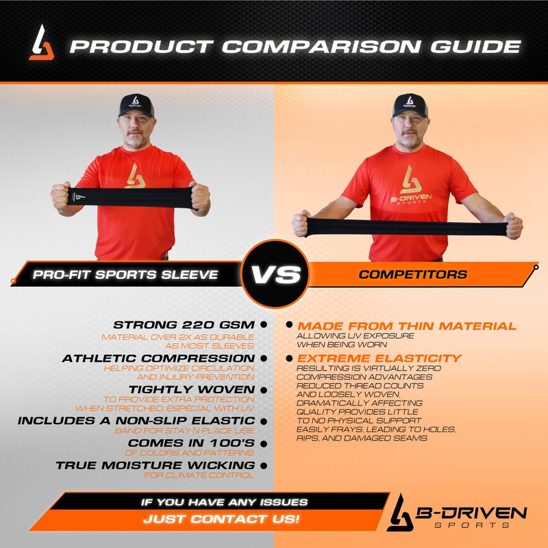 • The Pro-Fit arm sleeve is a "Premium" grade sleeve. Unlike thin sleeves you can literally see-through, our sleeves are made with 220gsm Pro-Fit compression material. They will last for 100's of washes, provide true athletic compression aiding in improved circulation, injury prevention, and pain management. Dri-Wick will remove sweat from your skin keeping you cool in the heat and warm in cooler climates and are a popular choice for protection from the sun and exterior elements.