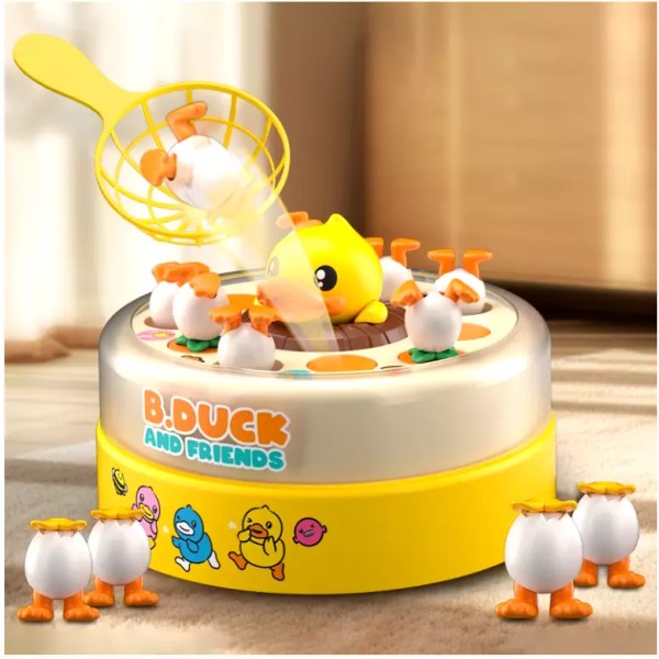 - 【Fun and Interactive Game for Kids】The B.Duck game is a delightful playset that includes a rotating game board, a B.Duck toy, 2 nets, 10 egg toys, and a themed sticker. Requires 3 AA batteries (not included).