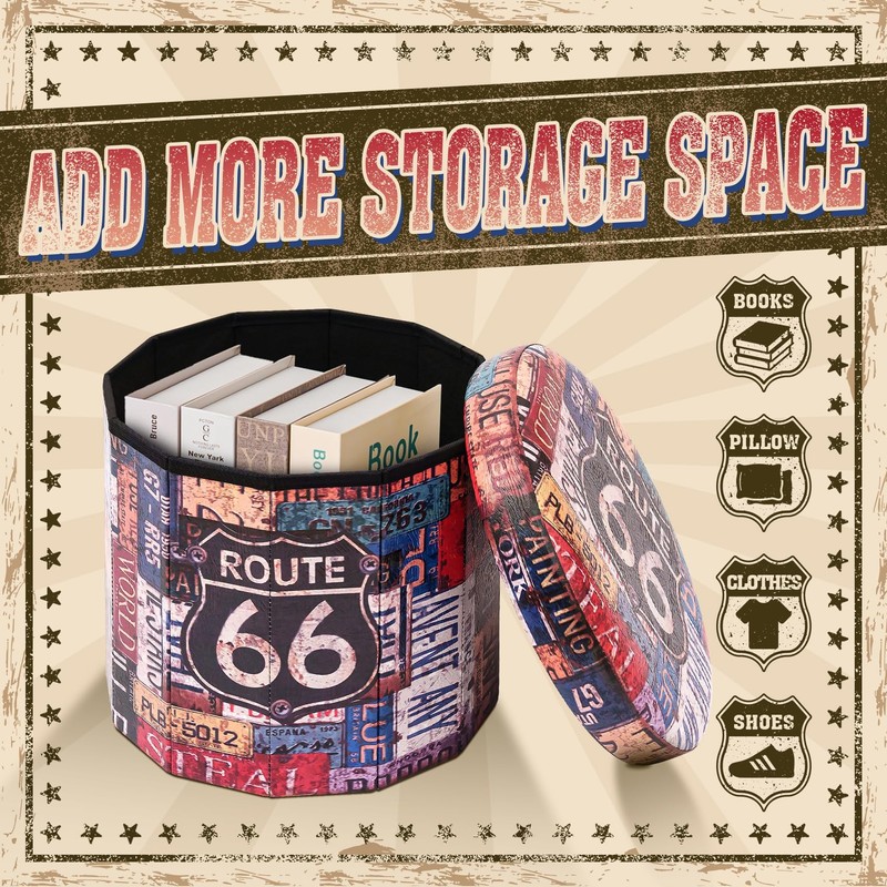 B FSOBEIIALEO Folding Storage Ottoman Round, Faux Leather Foot Rest Seat, Storage Organizer Toy Chest 15" (Route 66 Barrel)