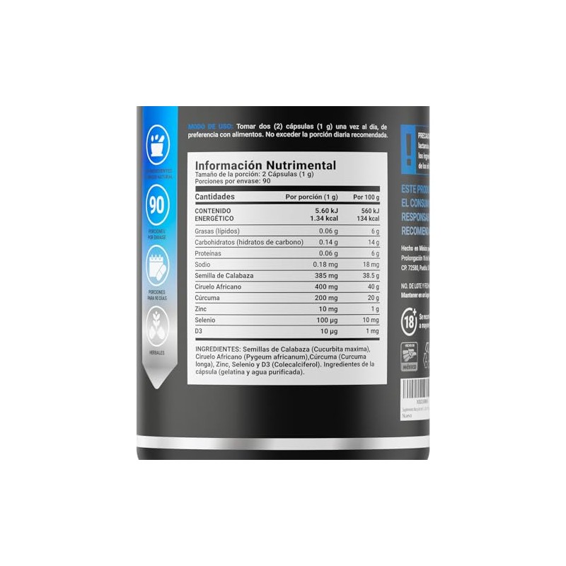B Life Company Frmula para Hombre 180 cpsulas 1000 mg por porcin. Ciruelo Africano, Selenio, Semilla de Calabaza, Crcuma, Zinc, y D3. Ingredientes...