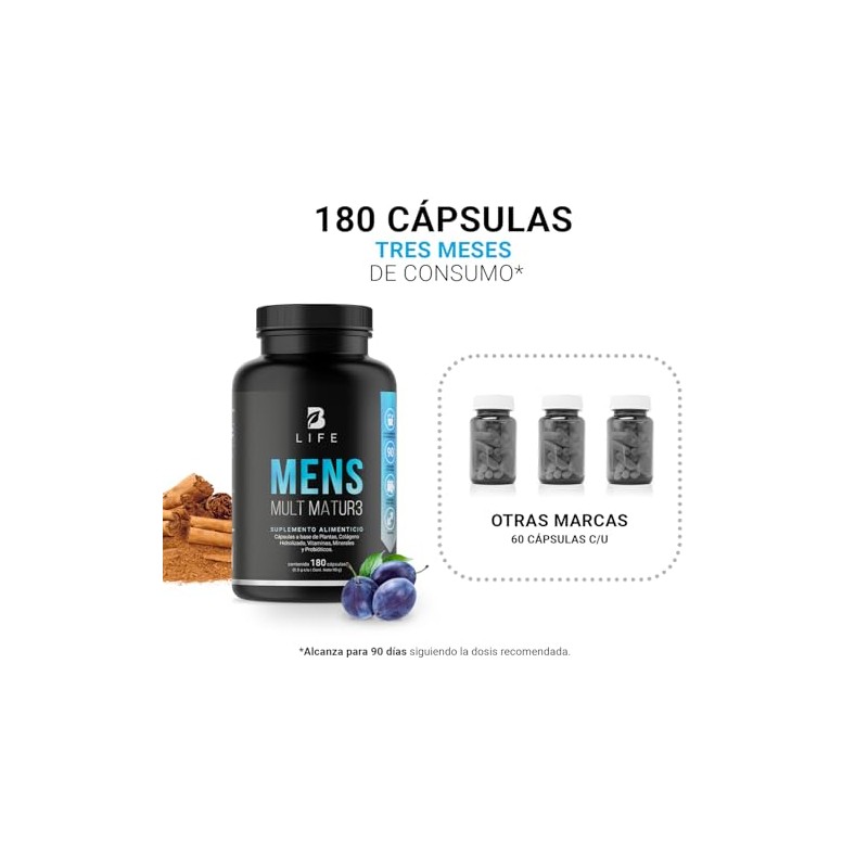 B Life Multivitamnico para Hombre 40 180 Cpsulas con Vitaminas A, C, D, E y ms Potenciadas con Calcio, Colgeno, Creatina y Probiticos para Vitalidad