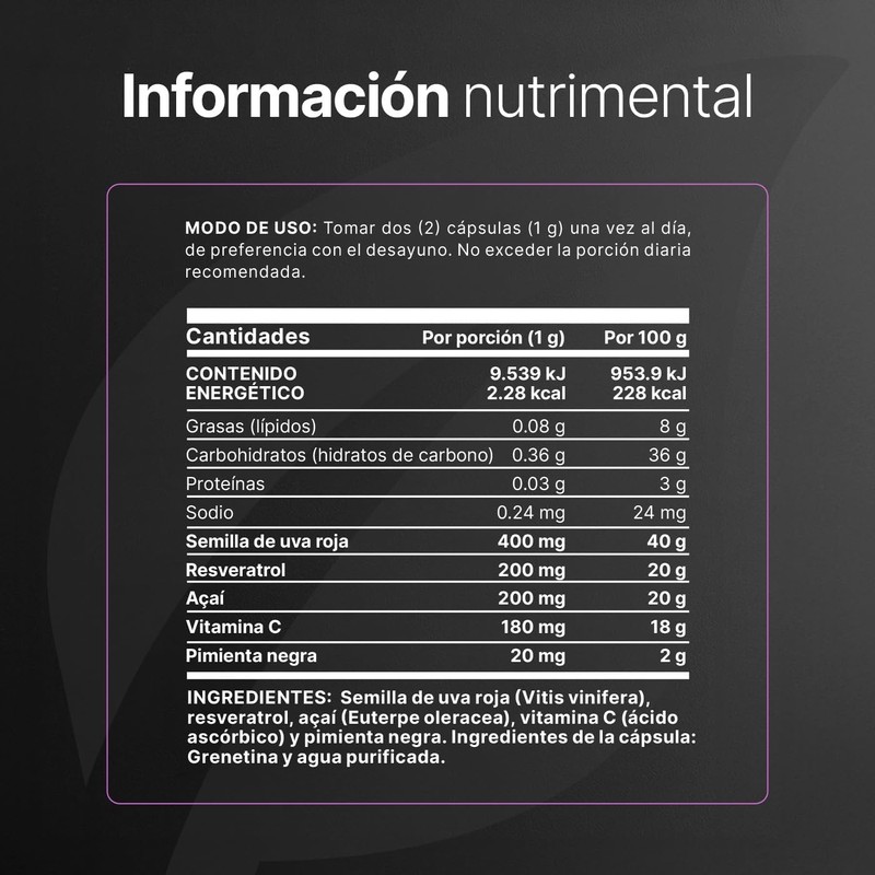 - ¡Resveratrol B Life, un poderoso antioxidante! Cada cápsula de 500 mg contiene una formulación especial a base de resveratrol, semillas de uva roja, açaí y vitamina C. Esta exclusiva fórmula está enriquecida con pimienta negra, lo que potencia la absorción de los nutrientes.