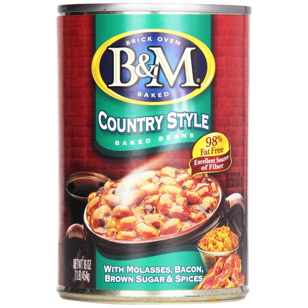 B&M® Country Style Baked Beans. Brick Oven Baked. Excellent Source of Fiber. 98% Fat Free. With Molasses, Bacon, Brown Sugar & Spices. See nutrition information for sodium content.
