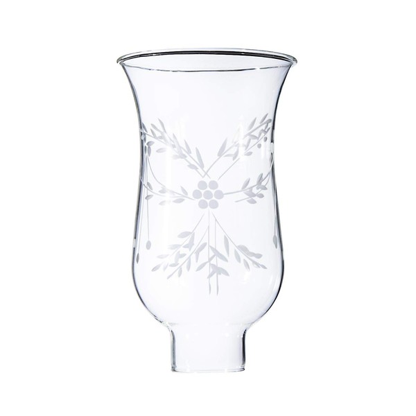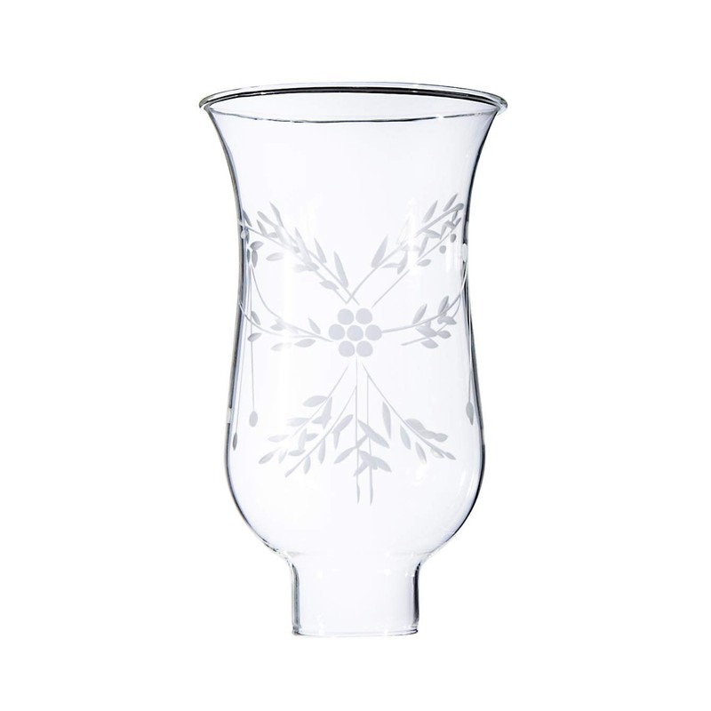The flower design on this lamp shade is cut into the glass. This glass hurricane style lamp shade is 6 1/2 inches tall.