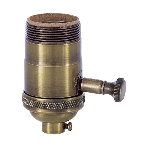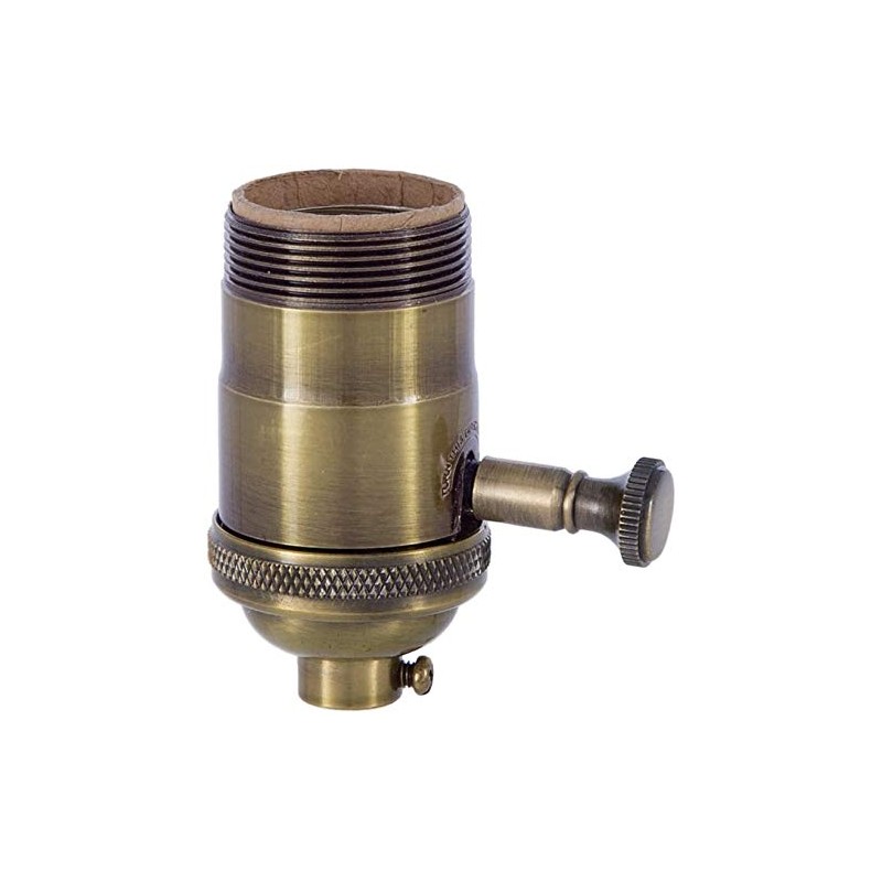 Antique Brass finish, high quality, U.L. listed lamp holders are specially designed for use in the manufacture and restoration of fine table and floor lamp lighting. Each style comes with a threaded cap and shell for superior strength and beauty. These are the lamp sockets of choice when mounting UNO fitter style lamp shades to bridge arm floor lamps. Large solid brass turn knob style switch with on/off interior and UNO thread style shell.