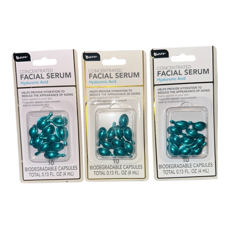 Introducing the luxurious B-Pure Concentrated Hyaluronic Facial Serum designed to rejuvenate and hydrate your skin. This exclusive pack includes a lot of 3 packages, each containing a series of biodegradable capsules that ensure freshness and precise dosage. Each capsule contains 0.13 fl oz (4 mL) of our highly concentrated serum, formulated with premium grade Hyaluronic Acid which is known for its intense hydration properties and ability to reduce the appearance of fine lines and wrinkles. The serum's quick-absorbing formula leaves your skin feeling silky smooth and is suitable for all skin types. The vibrant teal color of the capsules not only adds a touch of elegance to your skincare routine but also allows for easy visibility when applying. Perfect for both morning and evening use, this serum will become an essential part of your anti-aging skincare regime.