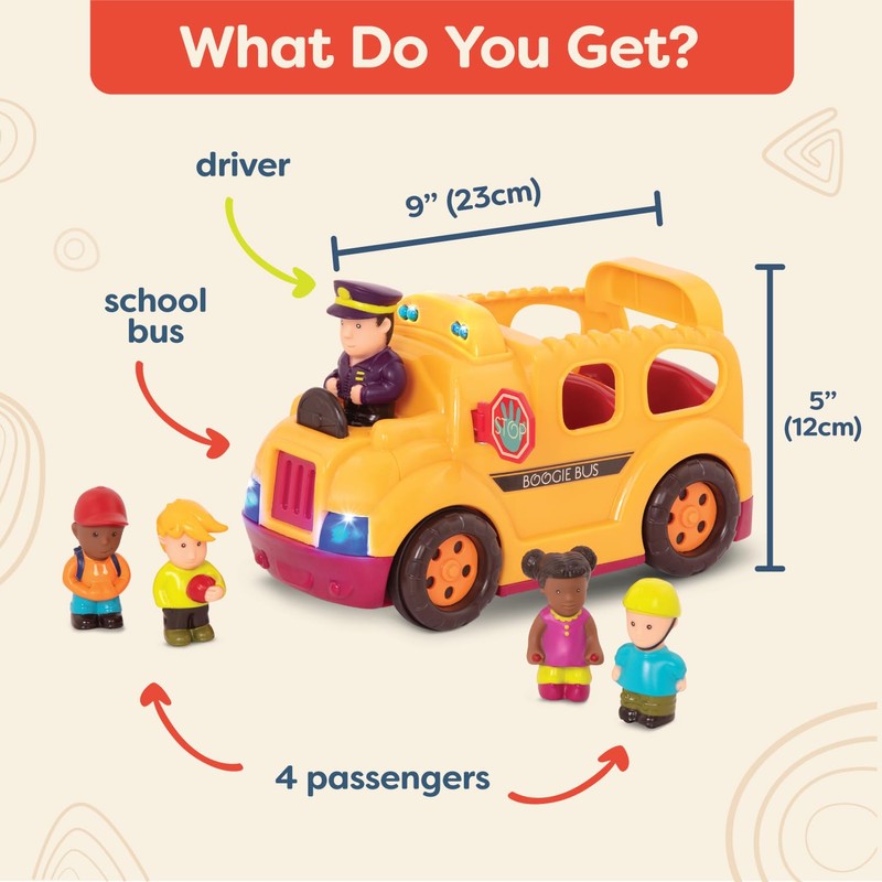 Press the driver's head to RRRRoll and the bus will take off! Wait a few seconds and the bus will stop again to pick up more passengers. The B. Rrroll Model - Boogie Bus comes with lights & sounds to captivate your little one for hours on end. 3 AA batteries required (included). Ages 1 year and up.