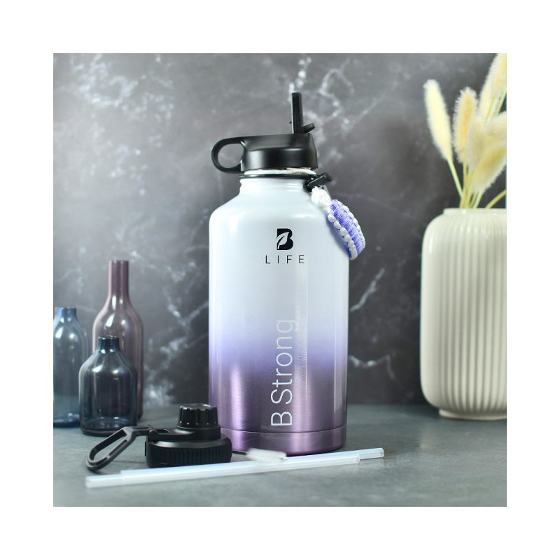 B Strong Botella Térmica de B Life es un termo color violeta de acero inoxidable y pared aislada con presentación de 25 oz (750 ml) y 64 oz (2 L). Es ideal para el gimnasio y mantiene bebidas frías y calientes hasta por 8 horas. Por su material, no libera componentes tóxicos y es muy resistente.