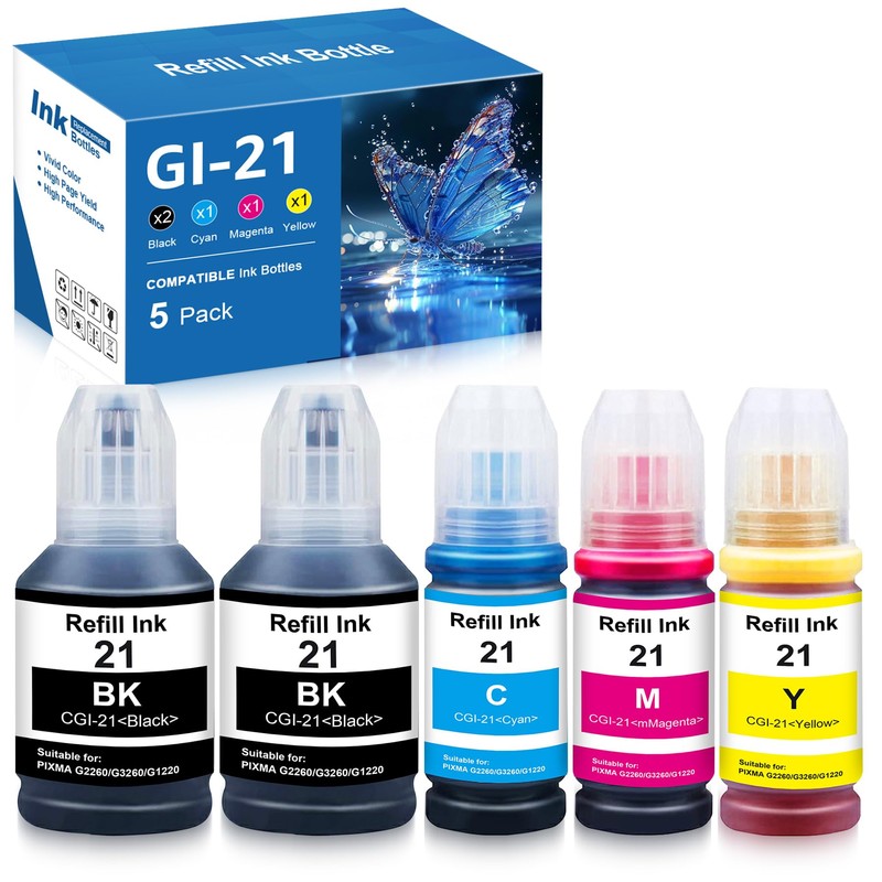 - 【Package List】 5 Pack Compatible Canon GI21 BK GI21 C GI21 M GI21 Y Ink Bottle. (2x GI 21 black ink, 1x GI 21 cyan ink, 1x GI 21 magenta ink, 1x GI 21 yellow ink)