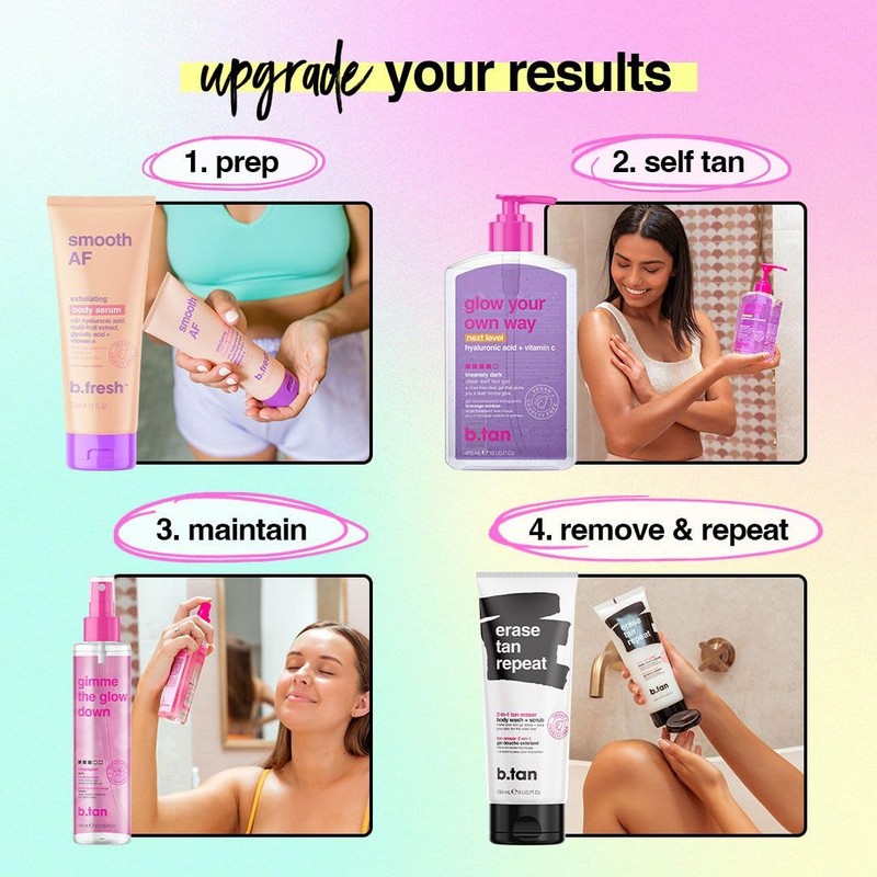 B.TAN b.tan Clear Self Tanning Gel & Exfoliating Kit | Next Level + Erase Tan Repeat Bundle - 1 Hour Express, Transfer-Resistant Ultra Dark Fake Tanner, 2-in-1 Exfoliator Scrub & Body Wash with Mitt