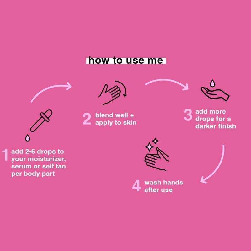 - You can use me to add tan to your daily face + body moisturizers and serums or to your self tan for an extra dark kick