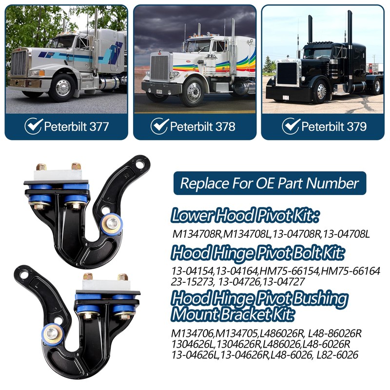 - 【Specified Models1】Lower Hood Pivot Assembly For Peterbilt 377 378 379,LH & RH Hood Pivot Kit Replace for M134708R,M134708L,13-04708R,13-04708L;Hood Hinge Pivot Bolt Kit Replace for 13-04154,13-04164,13-04726,13-04727,23-15273,HM75-66154,HM75-66164