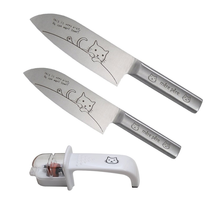 メルペール ネコ 三徳包丁 ペア セット 【オリジナル ネコ絵柄 包丁研ぎ付き】