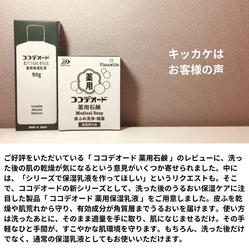 - ご好評頂いております「ココデオード薬用石鹸」と洗った後のうるおい保湿用の「ココデオード薬用保湿乳液」が一緒になったセットをご用意いたしました。