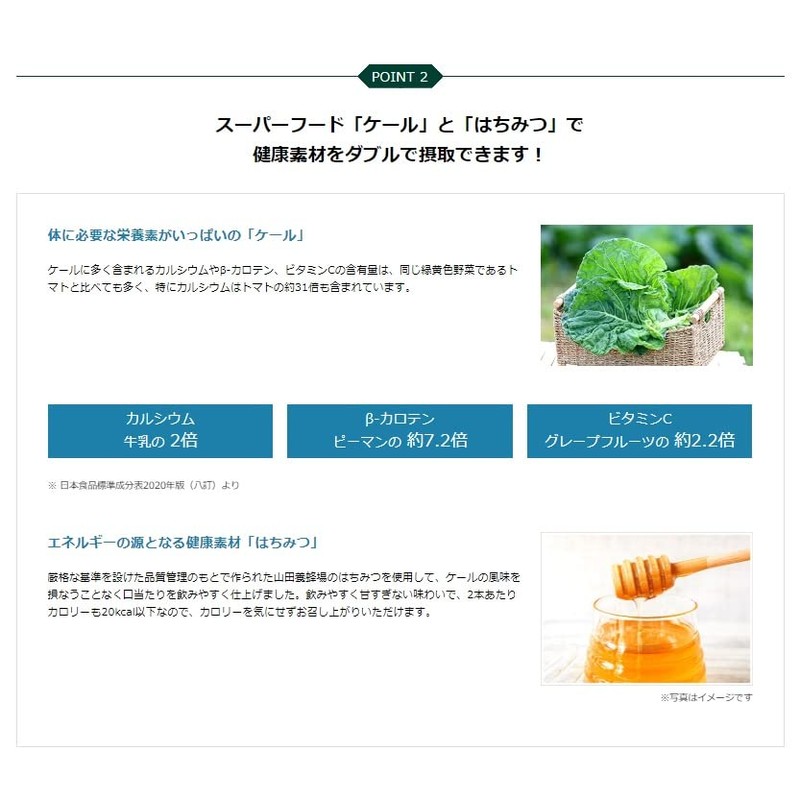 〇身体に必要な栄養素がいっぱいの「ケール」が主成分:原料のケールは、ビタミン・ミネラル・食物繊維など、現代人に不足しがちな栄養素を補うことができる「スーパーフード」。特にカルシウム、β-カロテン、ビタミンCなどを多く含むのが特長です。グラフは、青汁の原料となるケールと大麦若葉の栄養価を比較したものになります。栄養たっぷりのケールは健康の強い味方!野菜の栄養を手軽に摂りたい方にもおすすめです! 〇スーパーフード「ケール」と「はちみつ」で健康素材をダブルで摂取できます!:ケールに多く含まれるカルシウムやβ-カロテン、ビタミンCの含有量は、同じ緑黄色野菜であるトマトと比べても多く、特にカルシウムはトマトの約31倍も含まれています。厳格な基準を設けた品質管理のもとで作られた山田養蜂場のはちみつを使用して、ケールの風味を損なうことなく口当たりを飲みやすく仕上げました。飲みやすく甘すぎない味わいで、2本あたりカロリーも20kcal以下なので、カロリーを気にせずお召し上がりいただけます。 〇乳酸菌80億個、ビフィズス菌20億個、合計100億個※の善玉菌を配合し、毎朝のスッキリ習慣を応援します。※ 1本(3g)あたり 〇お召し上がり方:1本(3g)を80~100mlの水、または牛乳などと一緒に、十分に混ぜてからお召し上がりください。 ①コップに適量(80~100ml)の水や牛乳などを注ぎます。 ②1本(3g)の本商品を入れます。 ③スプーンやマドラーで十分にかき混ぜて出来上がりです。 〇保存方法:直射日光・高温多湿を避けて保存してください。 〇ご注意:・原料にはちみつを使用しているため、満1歳未満の乳児には食べさせないでください。 ・この商品はビタミンKを含みます。心臓、脳、血管などの疾患(いわゆる血栓症)でワルファリンカリウム(ワーファリン)などを服用中の方は召し上がらないでください。 ・原材料名をご確認の上、食物アレルギーのある方は召し上がらないでください。 ・お薬を服用中の方、野菜摂取制限を受けている方、通院中の方は、医師とご相談の上、お召し上がりください。 ・体質や体調により、まれに体に合わない場合があります。お体に合わない場合はご利用を中止し、医師にご相談ください。 ・乳幼児の手の届かないところに保管してください。 ・商品の特性上、かたまりが出来ることがありますが、味や成分には問題ありません。 ・水や他の飲料と混ぜた状態での保存は、風味や品質が劣化する原因となりますので避けてください。 ※パッケージは予告なく変更になる場合がございます。