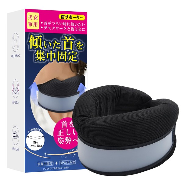 首 サポーター コルセット 頚椎 カラー 首用 ネックサポーター 折りたたみ式 ソフト 軽量 クッション 洗える本体 フリーサイズ 男女兼用 自宅用 外出用 仕事用 ブラック