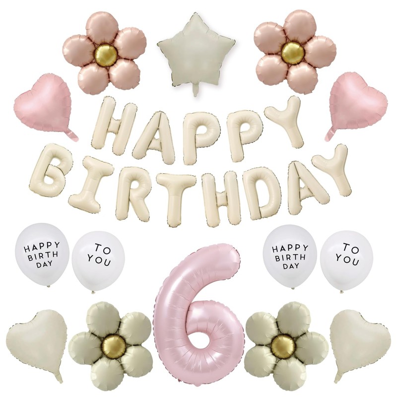 • 【仕様】80cm数字バルーン6歳用, バースデーガーランド HAPPY BIRTHDAY, ピンクフラワー×2枚, クリームフラワー×2枚, ピンクハート×2枚, クリームハート×2枚, ラテックスバルーン HAPPY BIRTHDAY×2枚, TO YOU×2枚, 付属品:ストロー, リボン