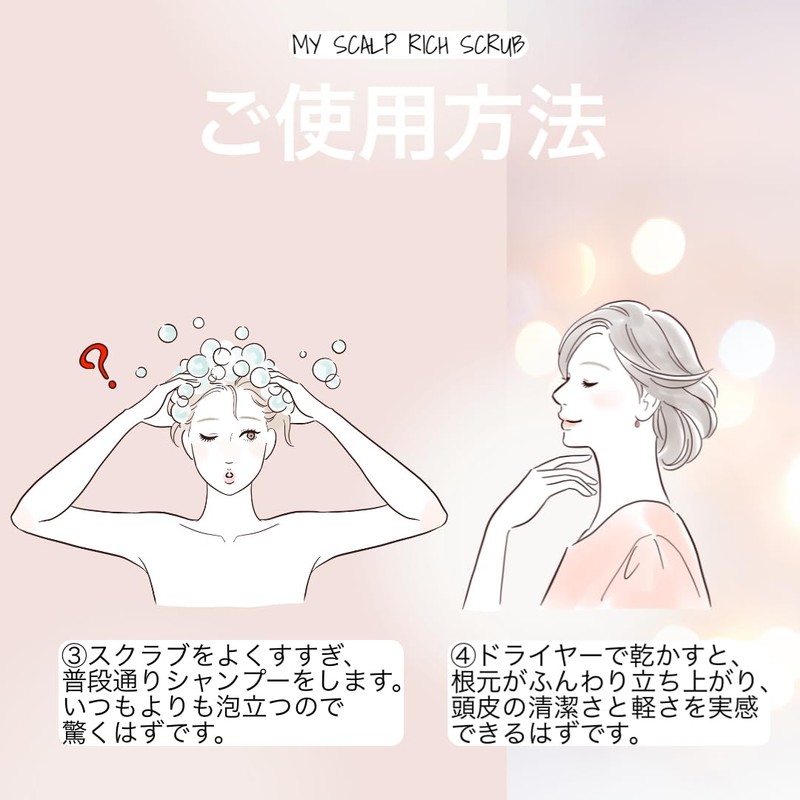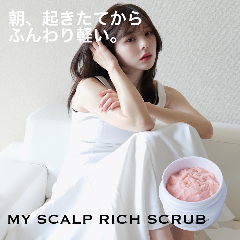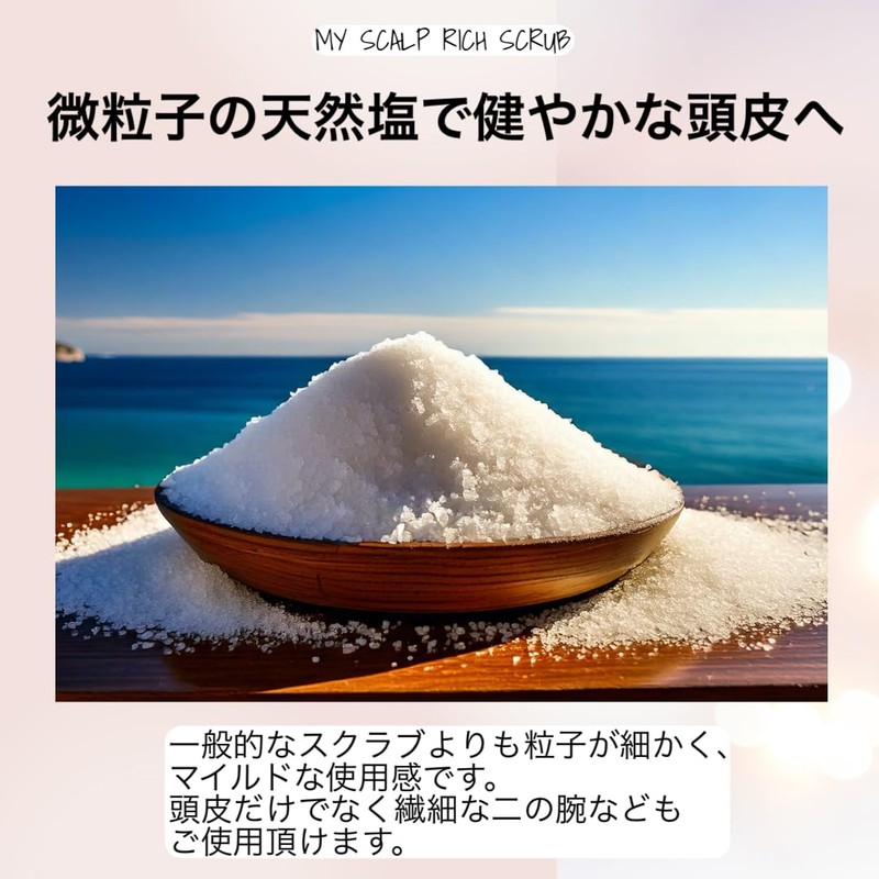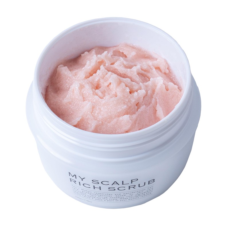 - 【ご使用方法】お湯で頭皮と髪をよくすすぎ、さくらんぼ小ほどのマイスキャルプリッチスクラブを手のひらで伸ばし、頭皮に馴染ませます。軽くマッサージした後、洗い流します。その後はいつも通りのシャンプー、トリートメント等でケアします。
