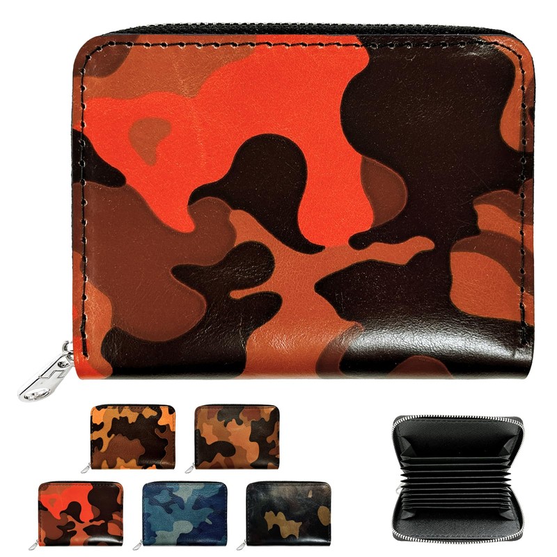 [トレンディヤマギシ] 本革 牛革 蛇腹シンプル財布 二つ折り 財布 メンズ 迷彩柄 カード収納 札入れ ラウンドファスナー カモフラージュ レッド