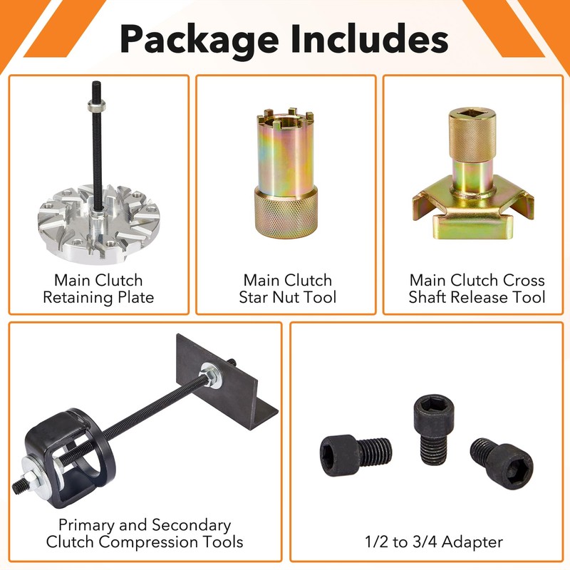 - Kit Contains: Clutch Compression Tool, Primary Clutch Holding Fixture Tool, Primary Clutch Spider Tool, Clutch Holder Tool, Clutch Spider Nut Tool, 1/2 to 3/4 Adaptor