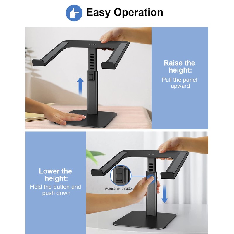• 【8 Adjustable Heights】 The 8 heights of the laptop screen are freely adjusted from 7.36" to 9.88" for the perfect eye level. The maximum height is special for people who want to change to a standing posture because of the discomfort caused by long sitting in the office. Pull up directly to raise the laptop holder, while lower it, you need to hold the button and push the pole down.