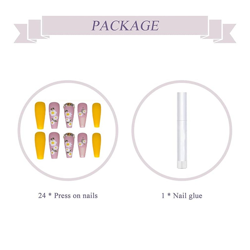 BABALAL 24Pcs Daisy Press on Nails Matte Glue on Acrylic Nails Long Ballerina Nail Art Tips Shiny Rhinestone Design Nails for Women and Girls