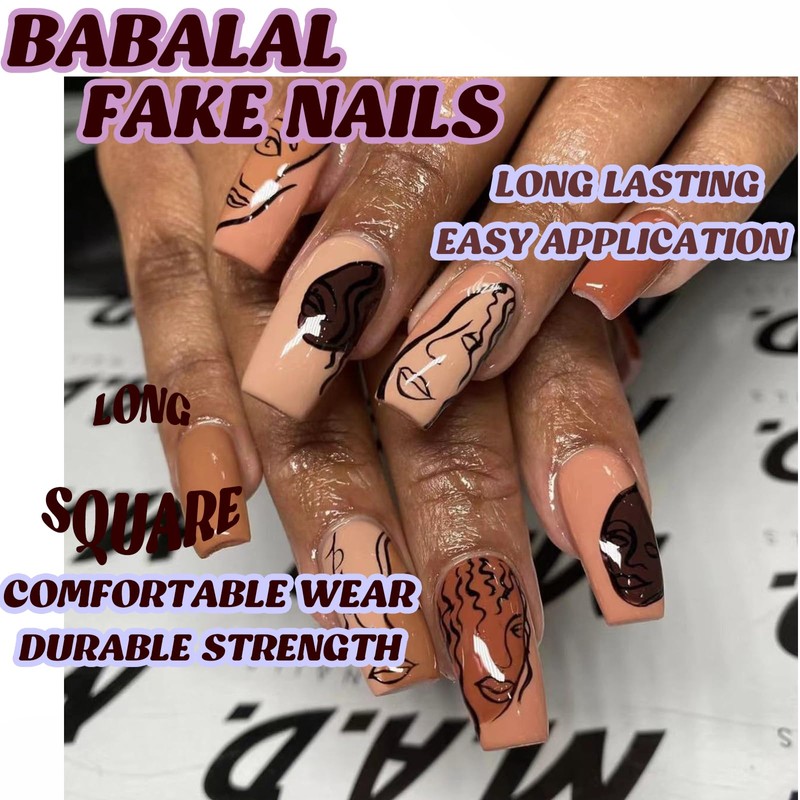 BABALAL Long Square Press on Nails Brown Fake Nails Abstract Art Design Glue ons Nails 24Pcs Squoval False Nails Fall Manicure Diy Clip on Nails
