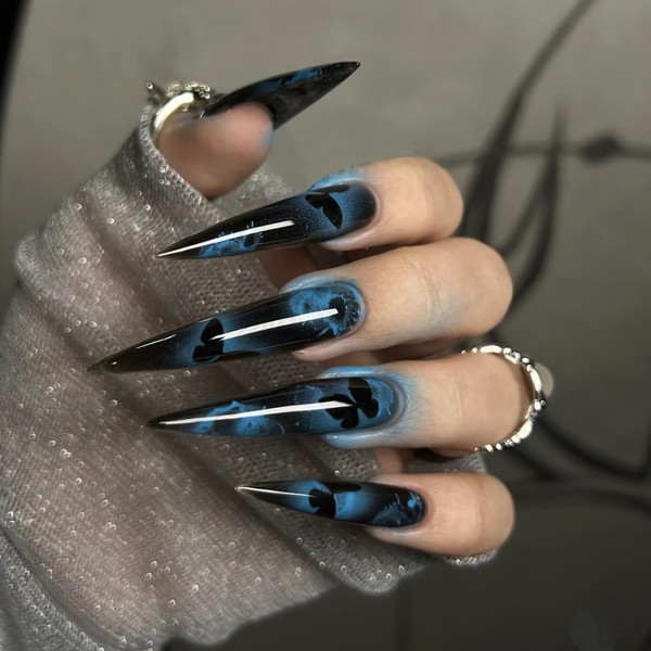 BABALAL Long Stiletto Press on Nails Almond Fake Nails Black Goth Acrylic Nails Supplies Blue Butterfly Y2k Glue on Nails Art 24Pcs Glossy Manicure Artificial Nails Full Cover False Nails