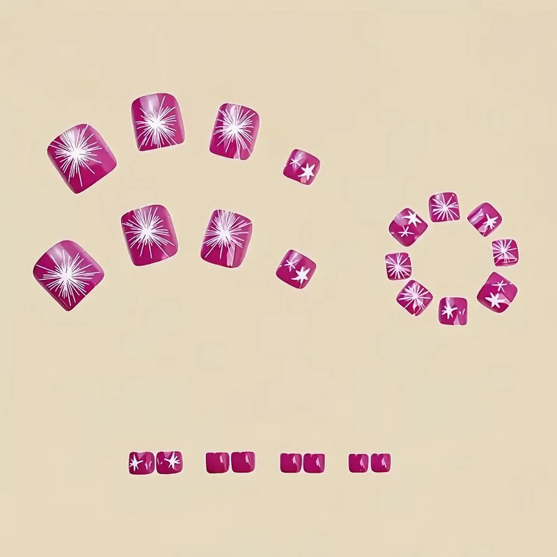 - Package Contents: You will get 24 pieces of fake toenails of different sizes, and 1 piece of nail glue sticker.Just a few minutes, it is easy to trim and file them to in any length and shape you like
