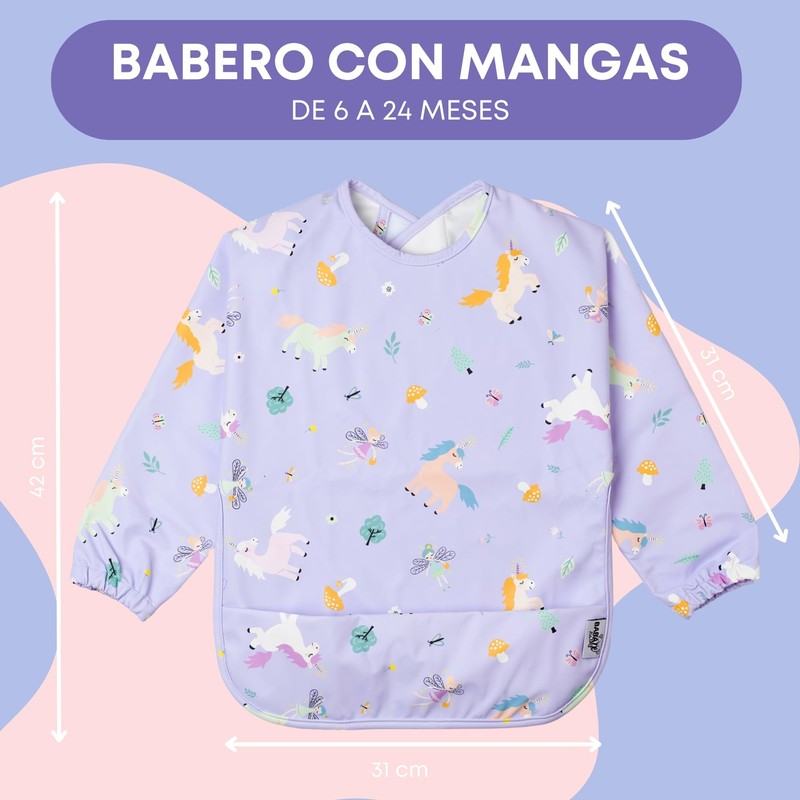 BABATÉ Kids Wasserdichte Baby-Lätzchen, Lätzchen mit Ärmeln, 6-24 Monate, Lätzchen, BLW, wasserdichte Lätzchen, Verzauberter Wald, Lila, Einheitsgröße