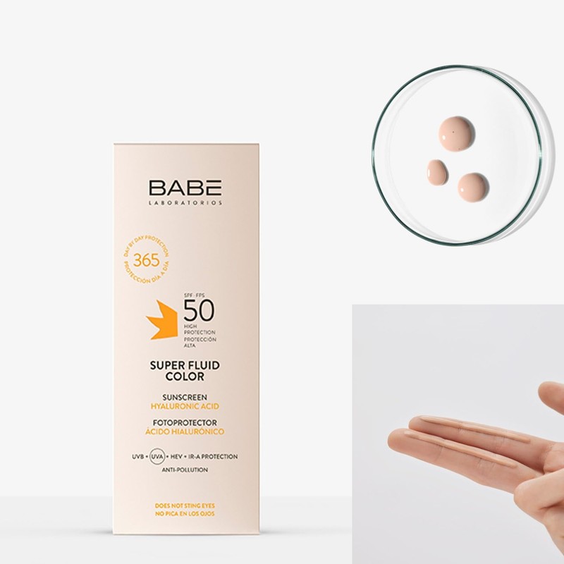 Babe Super Fluid Color Sunscreen SPF 50 C Tinted Facial Sunscreen Babe Super Fluid Color Sunscreen SPF 50 provides high broad-spectrum protection against UVA, UVB, blue light, and IR-A radiation while delivering a natural tinted finish. Its lightweight, ultra-fluid texture absorbs quickly without leaving a greasy residue, making it ideal for all skin types, including sensitive skin. Enriched with hyaluronic acid and carnosine, it moisturizes the skin and helps protect against free radicals. Ophthalmologically tested, it is gentle around the eyes and water-resistant for daily use. Key Features: Broad-spectrum SPF 50 protection against UVA/UVB, blue light, and infrared radiation Lightweight, non-greasy, fast-absorbing formula Contains hyaluronic acid for hydration and anti-aging benefits Includes carnosine, a natural antioxidant Suitable for sensitive skin and ophthalmologically tested Water-resistant for everyday activities Provides a natural tinted coverage for an even skin tone Usage Instructions: Apply evenly to clean skin as the final step in your skincare routine 30 minutes before sun exposure. Reapply every 2 hours or after swimming, sweating, or towel drying.
