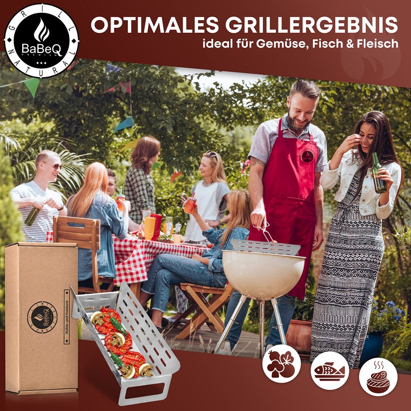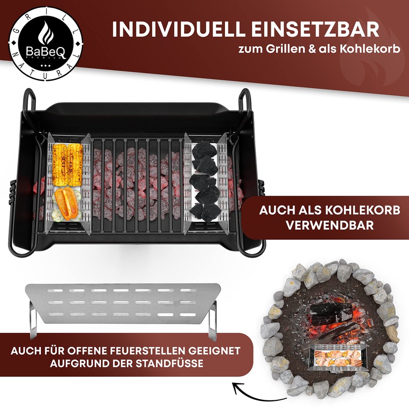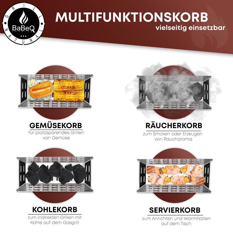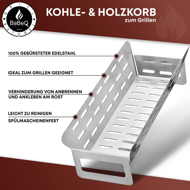 - 3-in-1 grill basket – the BABEQ multifunctional basket offers many possibilities on the grill. Whether classic for vegetables, fish or meat, the basket can also be used for smoking chips or even for additional charcoal.