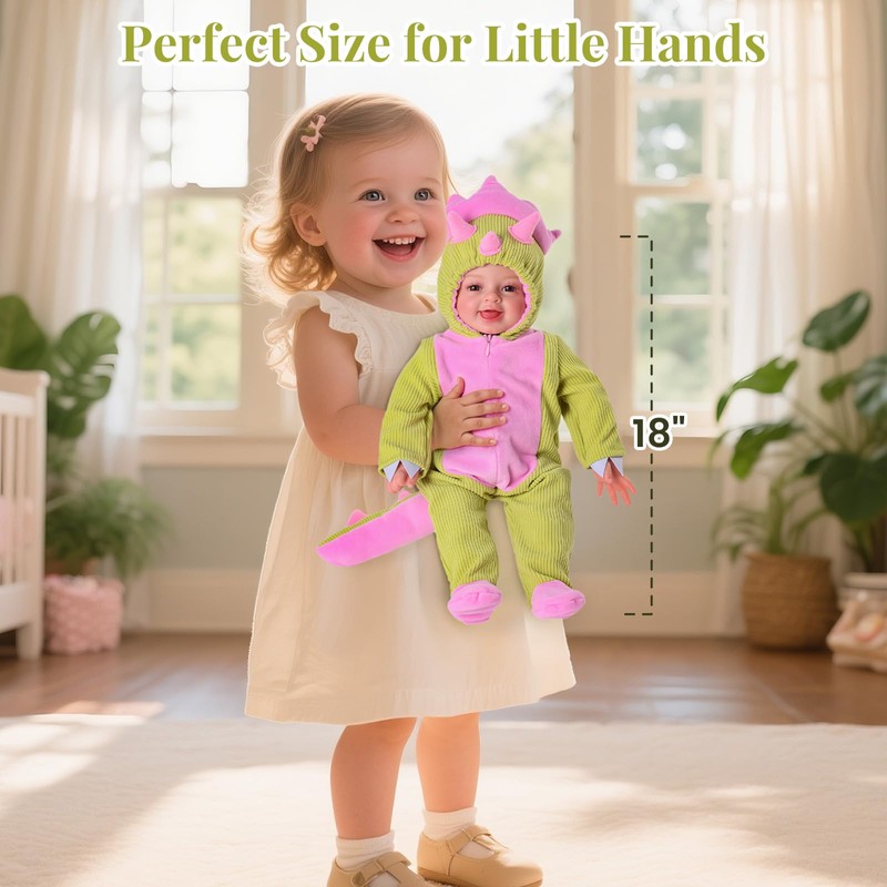 - Adorable Triceratops Design for Instant Smiles: Dressed in a pink and green triceratops outfit with horns and a tail, this real life baby doll captures hearts at first glance. Its sweet expression and cuddly costume make it perfect for imaginative play, cozy cuddles