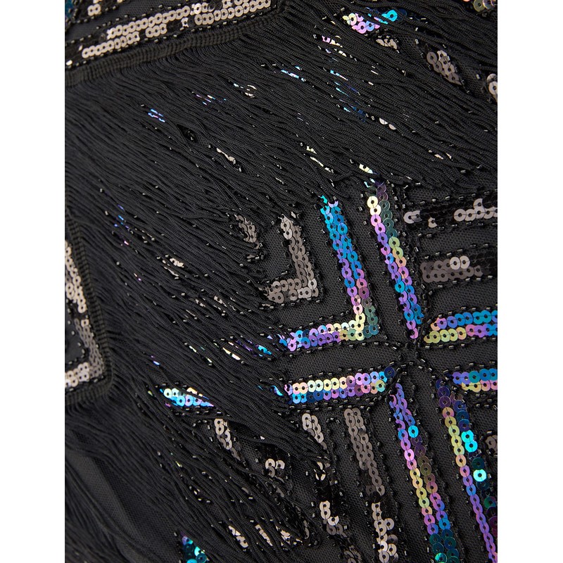 - Design: Classic 1920s striped design with sequins and beads accents for a charming pattern. The chest line and bottom hem are trimmed with long tassels to flatter the sexy and glamorous body line.