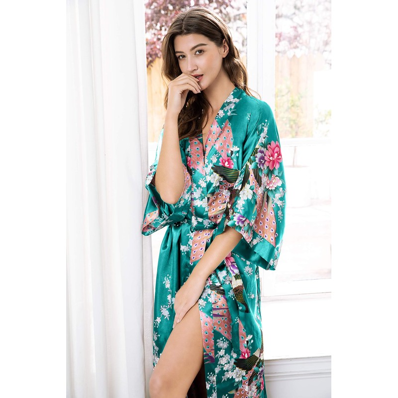 BABEYOND Women's Kimono Robe Long Satin Robes with Peacock and Blossoms Printed Kimono Nightgown