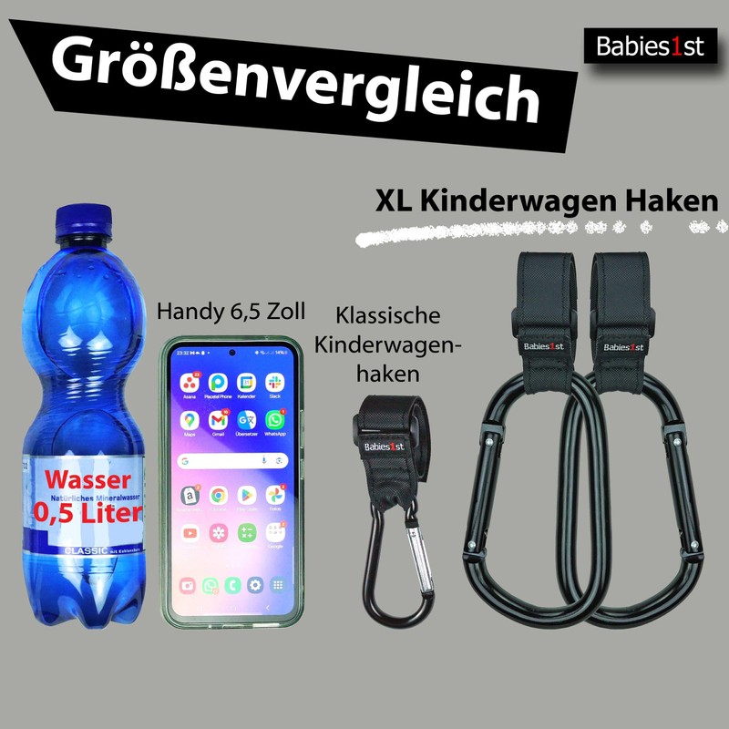 - The best of two designs – 1. Secure attachment - thanks to buckle and premium Velcro with anti-slip coating, the XL stroller hooks also hold on sloping elements. 2. Oversize - 14 x 8 cm carabiner hooks offer enough space even for multiple pockets, wide handles, toys or a balance bike.