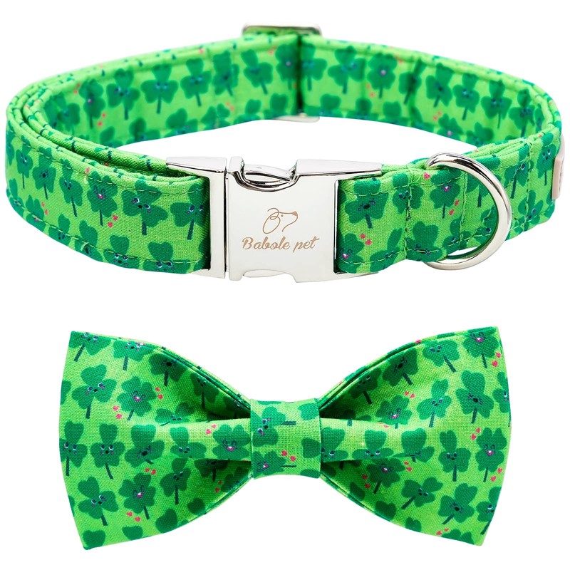 Babole Pet St.Patrick's Day Dog Collar with Bow Tie-Babole Pet, Cute Clover Male Dog Collar with Safety Metal Buckle Adjustable Puppy Collars for Small Medium Large Boy Girl Dog,L-Neck 16"-24"