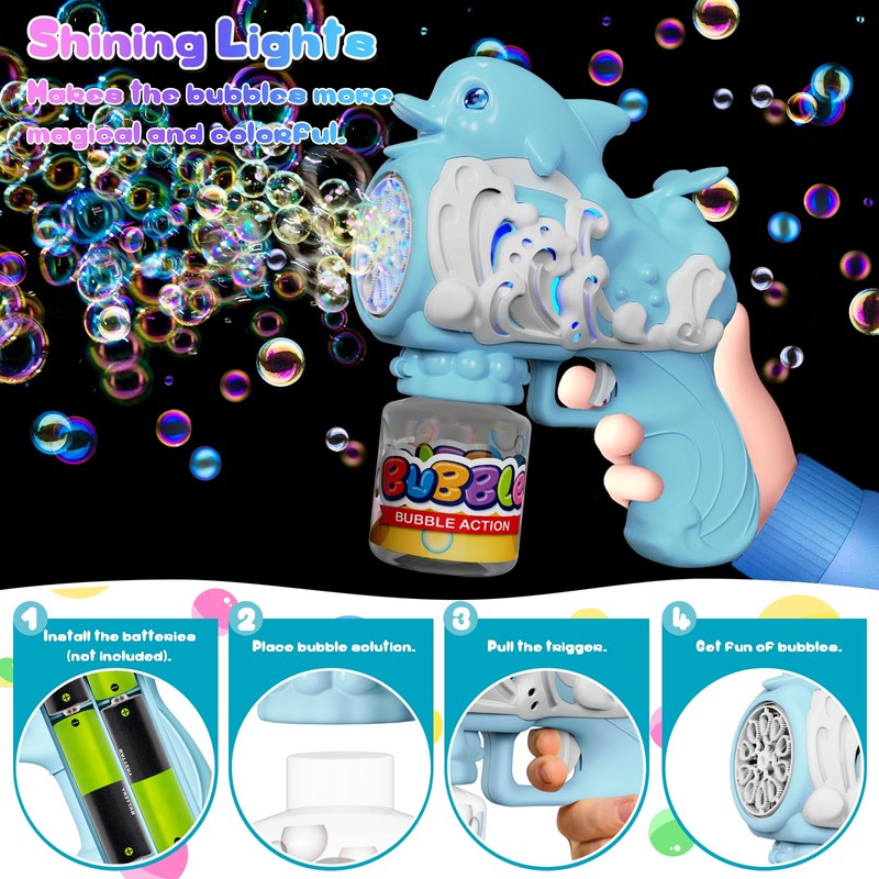 - [Dolphin Bubble Gun] Our bubble gun with a lovely dolphin looking, the adorable design is loved by all aged of kids, and increase the interesting for the children outdoor in the dreamy bubble world. Well, let your little kids go wild, and enjoy the endless fun from this bubble machine.