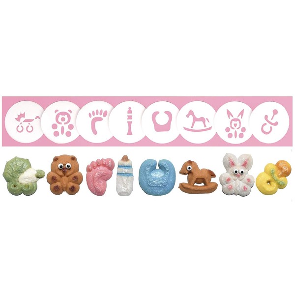 - 8 COOKIE PRESS DISKS IN 8 FUN DESIGNS: Baby Bib, Baby Bottle, Baby Carriage, Baby Foot, Baby Teddy Bear, Bunny 2, Pacifier and Rocking Horse.
