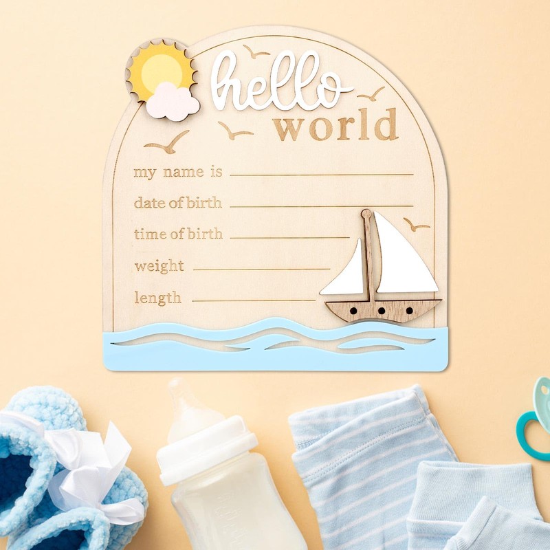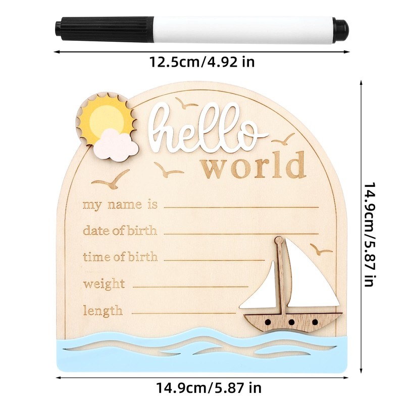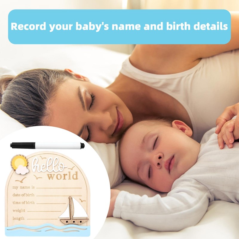 Baby Announcement Sign, Sailing Wooden Hello World Newborn Signs with Pen Cute Welcome Baby Name Board for Girls Boys Nursery Gift Decor Photo Props