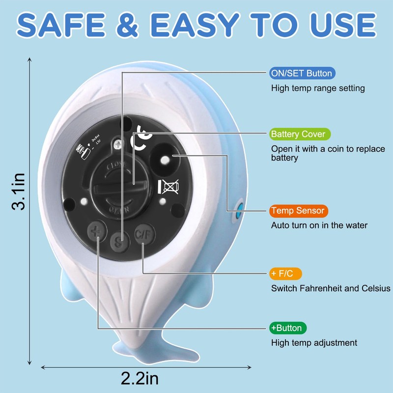 - 【𝑴𝒐𝒓𝒆 𝒂𝒅𝒗𝒂𝒏𝒕𝒂𝒈𝒆𝒔】Just place it in water for instant temperature readings, automatic shut-off after 10 seconds out of the water, easily switch between °C/°F, and set high-temperature alerts on different age. It can even be used as a room/swimming pool thermometer!