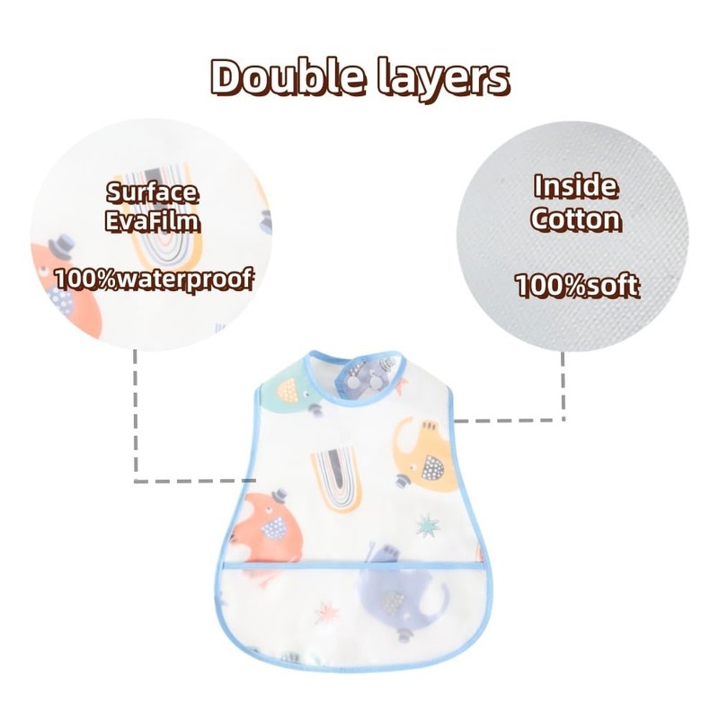 - These 2 layer Design, The bib's Surface is 100% EVA,Back 100% Cotton, make sure the pocket SOFT AND SAFETY, Using Back 100% Cotton Design make sure there was no fading or odor.