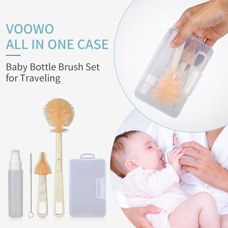 Baby Bottle Brush, VOOWO Portable Travel Bottle Cleaner Kit, Silicone Baby Bottle Cleaner Brush Set with Baby Bottle Brush for Cleaning, Nipple Brush, Straw Cleaner, Bottle Soap Dispenser (White)