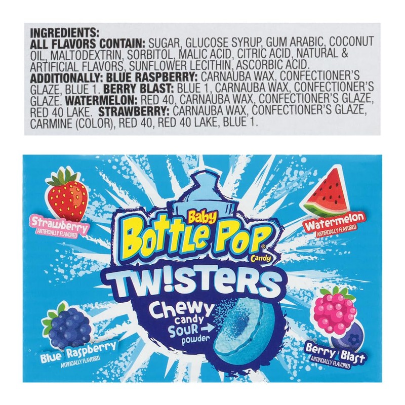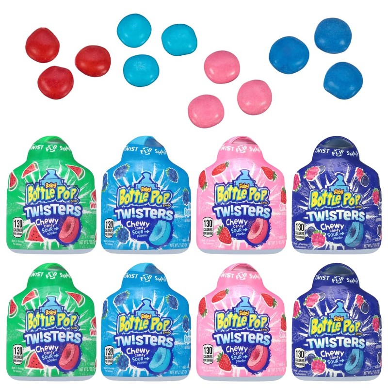Enjoy the excitement of Baby Bottle Pop Twisters Chewy Candy, a great addition to your bulk candy stash. This sweet treat is suitable for a sour candy variety pack adventure as it combines a light hard candy shell with a chewy center mixed with a pop of sour powder, making it great for bulk individually wrapped candy bundles. Featuring an assortment of mouth-watering fruity flavors like Strawberry, Blue Raspberry, Watermelon, and Berry Blast, these candies are great for kids. The versatility of Baby Bottle Pop Twisters fits any occasion, from sweet treats for kids to being suitable birthday party favors. They can be used for those who love mixing sweet and sour in every bite. As part of your candy bulk assortment, they're a go-to favorite, beloved by both kids and adults. Whether filling goodie bags or providing treats at a festive gathering, these chewy candies bring joy and excitement to events. Let Baby Bottle Pop Twisters elevate your celebrations and gatherings, making them memorable with every chewy, flavorful twist. Disclaimer: Not for children 3 and under.