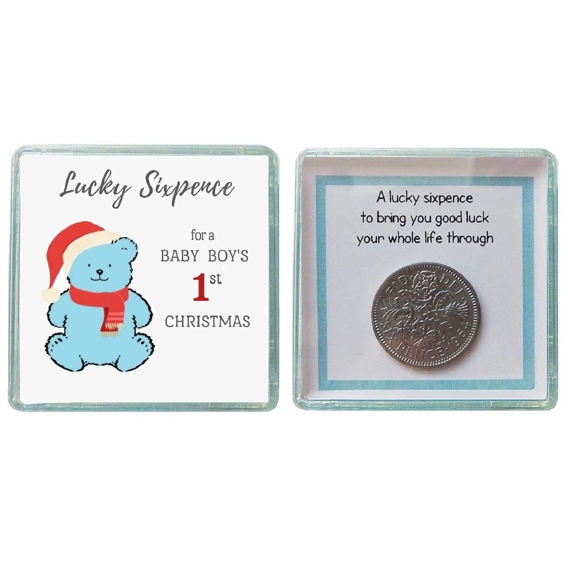 - Baby boy's first 1st Christmas stocking filler gift lucky sixpence cased keepsake