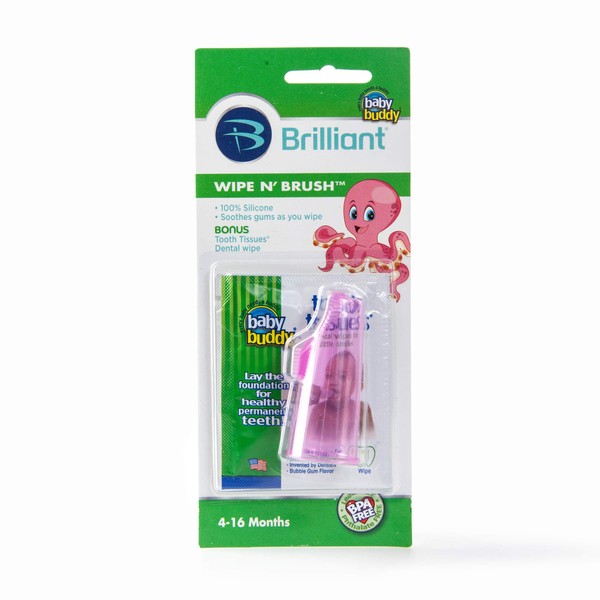Babies will "drool" over the feel of soft silicone on their gentle and tender gums. The Wipe-N-Brush is for use with dental wipes, like our Tooth Tissues, or gauze. Parents can wipe and brush with this "buddy" as they continue to journey on the path of healthy oral hygiene. Wipe-N-Brush also takes the "bite" out of teething, as parents clean and soothe precious gums. Each package includes a 1 count Tooth Tissues starter pack. Wipe-N-Brush is intended for children age 4-16 months. When back molars are in, parents should transition to brushing teeth with a toothbrush.