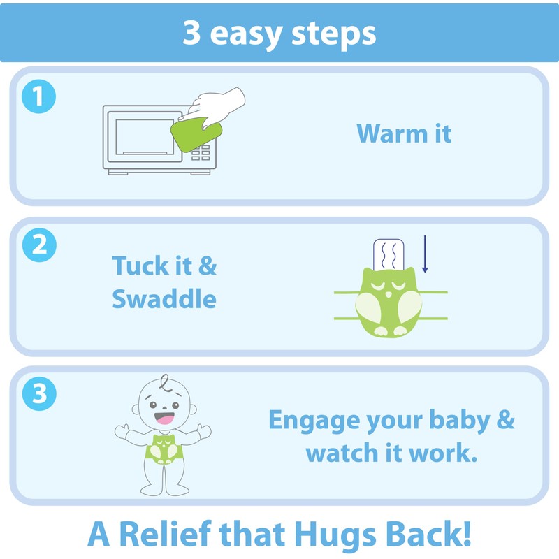 - Infant gas and colic relief – Heated gel pack helps with tummy aches, gas, colic and constipation