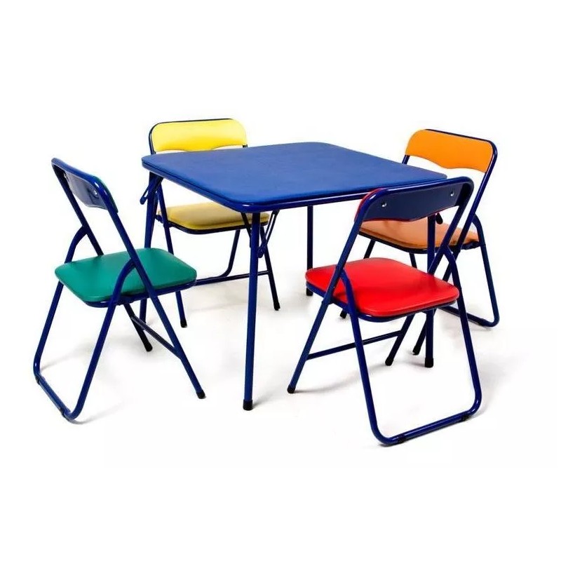Este modelo consta de cinco piezas, con una mesa y cuatro sillas de colores acojinadas. Al tener estructura de metal, pueden ir tanto fuera como dentro de la casa. Sin duda los niños pasarán horas jugando a la comidita, usándola como descanso, para sus clases en linea, o como parte de sus miles de juegos.