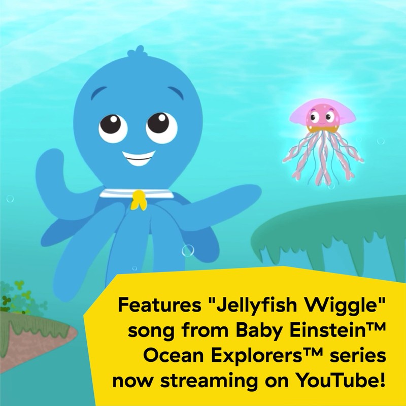 - Eight plush arms respond to baby’s slightest touch; Features 4 songs from Baby Einstein Ocean Explorers YouTube series with volume control; Requires 3 AA batteries; Dimensions: 9.4 x 9.4 x 9.0 inches