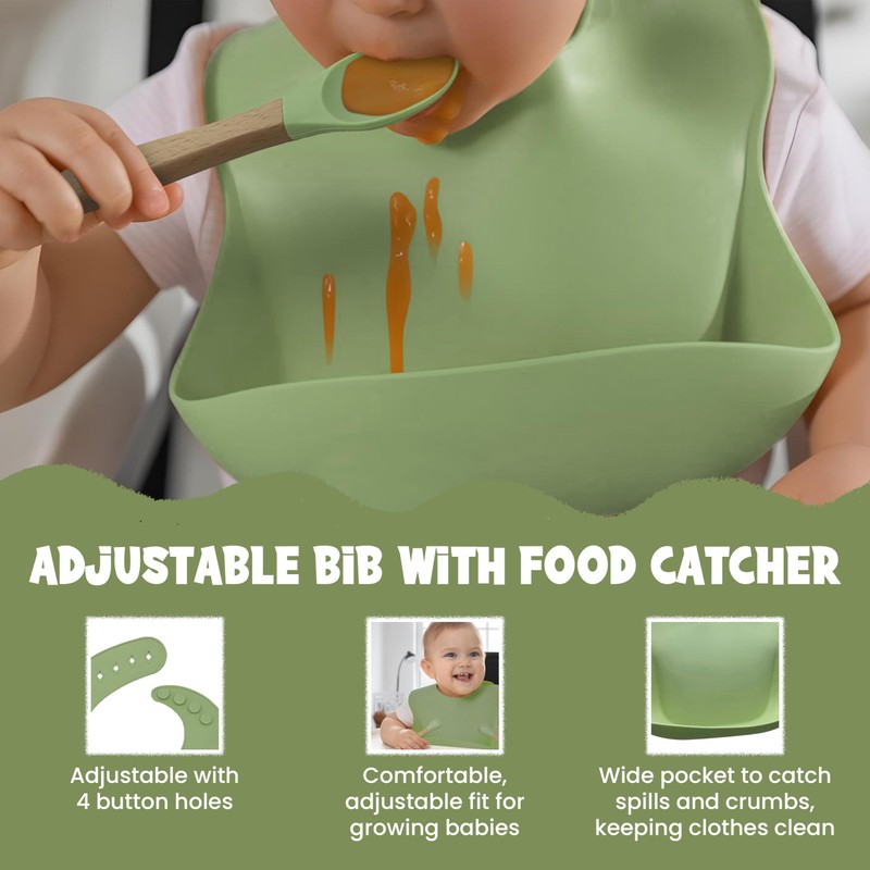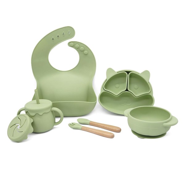 Baby Feeding Essentials, Baby Led Weaning Supplies, Silicone Baby Feeding Set, with Baby Spoon, Fork, Baby Bib, Sippy Cup, Suction Plate, Suction Bowl, Baby Eating Essentials, 6+ Months (Olive)